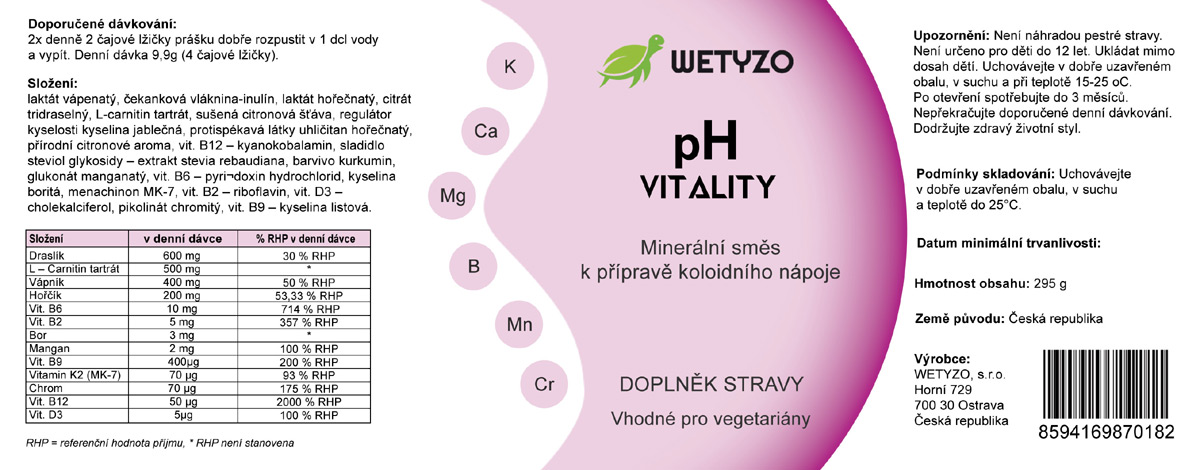 pH Vitality je potravní doplněk vhodný pro odkyselení organismu, ale také přispívá k zabránění svalových křečí. Kombinace organicky vázaných minerálů v sypké formě - snadná příprava rozmícháním malého množství ve vodě.