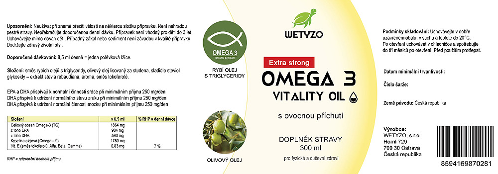 Omega-3 Vitality je vyvážená kombinace vysoce kvalitního triglyceridového rybího oleje a extra panenského olivového oleje s vysokým obsahem polyfenolů. Díky příjemné ovocné chuti je pravidelná konzumace rybího oleje opravdovým zážitkem.