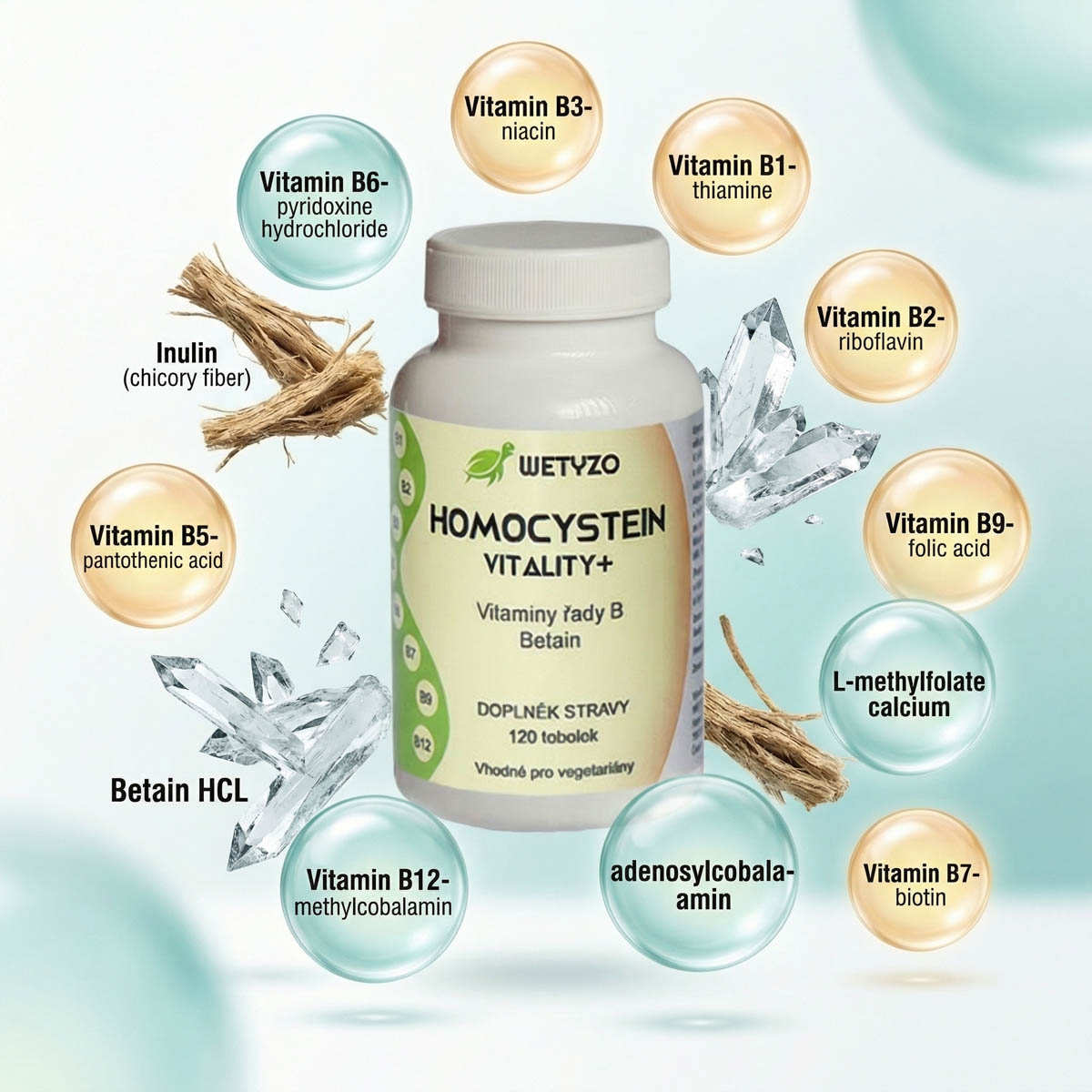 Homocystein Vitality+ s betainem je doplněk stravy vytvořený na základě spolupráce s MUDr. Karlem Erbenem a Mgr. Michaelou Verde Beitlovou, který díky vitamínům B6, B9, B12 a betainu přispívá  k normálnímu metabolismu homocysteinu.